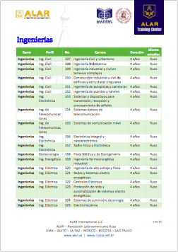 Rusia ofrece carreras en las ramas clásicas de la Ingeniería pero adicionalmente en ramas de vanguardia como: Ing. Aeroespacial, Ing. Aeronáutica, Ing. Genética, Ing. Nanotecnologías, Ing. Robótica y Mecatrónica.